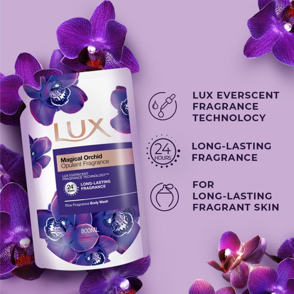 Lux Magical Orchid body wash is crafted by master perfumers with notes of black orchid and peony and uses groundbreaking Lux Everscent Fragrance Technology that provides 24 Hours Long Lasting Fragrance.