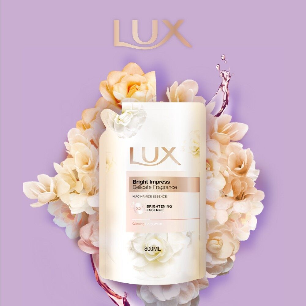 Lux Bright Impress provides 3X Brightening Essence with Niacinamide for glowing and fragrant skin. This glowing body wash has Jasmine and Peach notes for a delicate fragrance, suitable for your every shower.
